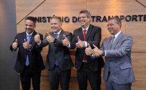 O governador Paulo Dantas assinou nesta terça-feira (3) o edital de licitação para a construção da ponte rodoviária entre Penedo (AL) e Neópolis (SE), na sede do Ministério dos Transportes, em Brasília.  O documento também foi assinado pelos ministros dos Transportes, Renan Filho, da Secretaria Geral da Presidência, Márcio Macedo, e pelo governador de Sergipe, Fábio Mitidieri.