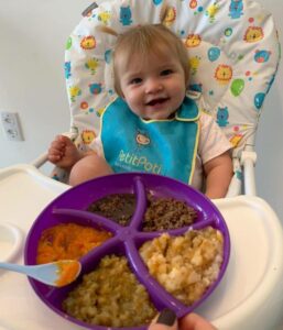 As refeições produzidas pela Petit Poti são divididas por três ciclos. O primeiro é indicado para a introdução alimentar e tem uma consistência mais pastosa, no ciclo 2, para bebês a partir dos 9 meses, a textura da comida vai evoluindo e já conta com alguns pedacinhos e no ciclo 3, indicado para crianças acima de 12 meses, a refeição já possui pedaços maiores, já que nesse período a criança está preparada para mastigar.