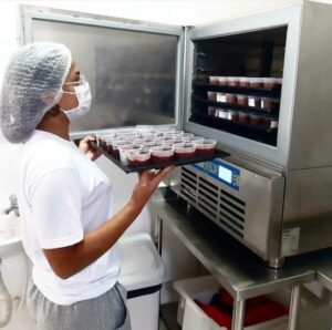 A equipe da Petit Poti é composta por pediatra, nutricionista, cozinheira e auxiliares e todo o processo das refeições é realizado na cozinha da empresa. “Aqui nós pensamos em todos os detalhes do princípio ao fim do processo. Após a cocção, as nossas comidinhas são amassadas manualmente para que a textura e fibra do alimento se mantenham, depois elas passam pelo processo de ultra congelamento e seguem para a câmara fria, o que garante maior segurança microbiológica e uma melhor conservação. Esse processo garante mais proteção microbiológica, pois o alimento sai de uma temperatura muito alta para uma temperatura muito baixa muito rápido e vai direto para nossa câmara fria onde fica armazenado. Os preparos são porcionados em embalagens especiais e BPA free (livre de bisfenol A). As embalagens também podem ir ao freezer e ao micro-ondas e já servem também como pratinho para servir os bebês”, explica.